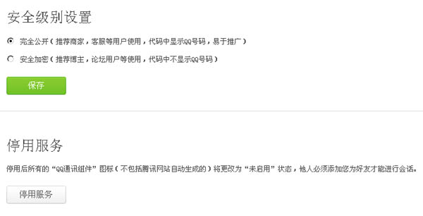 同時(shí)建議客戶安全級(jí)別設(shè)置中選擇“完全公開(kāi)”(推薦商家,客服等用戶使用,代碼中顯示QQ號(hào)碼,易于推廣),這樣任何人不需要加好友就可以直接打開(kāi)qq進(jìn)行對(duì)話或留言,省去驗(yàn)證或不在線無(wú)法交流的情況。